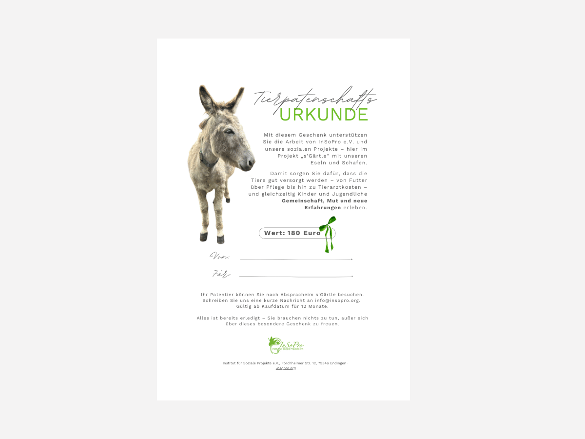 Ihr erhaltet eine Patenschaftsurkunde – für euch selbst oder als Geschenk an eine andere Person.
